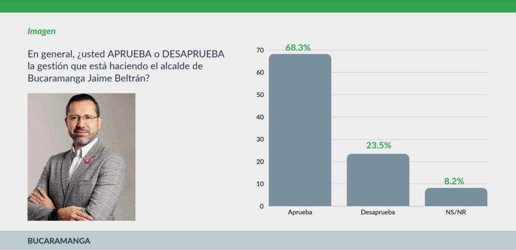 Con una aprobación del 68,3% y una desaprobación de apenas el 23,5%, Beltrán se posiciona como el tercer alcalde con mejor favorabilidad del país, superando a figuras nacionales como Fico Gutiérrez en Medellín (60,2%), Carlos Fernando Galán en Bogotá (55%) y Alejandro Eder en Cali (52,2%). Solo lo superan dos pesos pesados: Álex Char en Barranquilla (85,4%) y Dumek Turbay en Cartagena (75,6%).